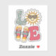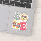 Cute vintage laptop sticker with text, "Love" along with a smiling summer sun wearing leopard print sunglasses, and beach flip flops decorated with flowers and retro stripes