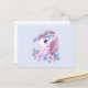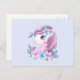 A postcard with an adorable image of a sweet baby unicorn head portrait. A gentle butterfly visiting, fluttering near her nose. A bouquet of flowers around her neck complete this very cute design.