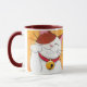 Cute Maneki Neko Lucky cat mug design. Cheerful white and brown calico cat sitting in a beckoning position associated with Japanese Maneki Neko Cats. He wears a red collar with a huge golden bell and has either his left or right paw raised depending on which side of the mug you look at. Kitty cuteness for cat lovers. Would make a great gift! Created from an original painting © 2009 Lisa Marie Robinson