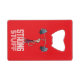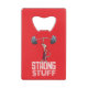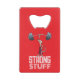 A funny meerkat weightlifter on a credit card bottle opener. Use "Personalise this template" to change the "STRONG STUFF" text and make a unique, customised gift; text changes are reflected on both sides. Crack open the strong stuff with this bottle opener, featuring a cute cartoon of a skinny meerkat in big shorts, smiling as he effortlessly lifts a huge barbell with one finger. For fans of booze, weightlifting, meerkats and/or working out.