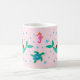 This mug features a cute whimsical mermaid under the sea design with fish, turtle, seahorse and starfish on a pastel pink background. Personalise it with a name.
