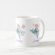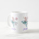 A mug with an adorable illustration. Designed with a pretty mermaid girl riding a happy dolphin. A little jellyfish friend accompanies them. Decorated with little splatters of faux gold glitter.