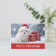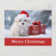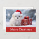 Send Merry Christmas greetings to your family and friends this year with this postcard featuring a cute puppy dog wearing a santa hat in the snow and a present!