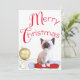 This flat Christmas card features an adorable Siamese kitten standing on Santa's hat on a table of gold stars and a gold ornament. Red "Merry Christmas" typography sits above the design. Personalize the back greetings in the text fields, remove either or all template text to leave room for a handwritten note or click customize to select a font style, size, and color you like.