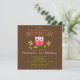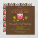 Start you girl birthday party off right with our adorable pink & red owl kids birthday party invitations. Our sweet owl invite features a cute little owl sitting on a green leaf tree branch with flowers and is set on a brown stylish brown background. The owl girls birthday party invitation features an unique owl pattern background. Visit our shop for matching thank you note cards, birthday stickers, thank you stickers and postage stamps. © Petit Tatti