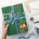 Modern, elegant, and cute Christmas wrapping paper, with a cartoon of Santa Clause in his red hat and costume, the text "Merry Christmas & Happy New Year 20XX" in stylish script / calligraphy handwriting, and a personalised name. With sprinkles of white and silver snowflakes, and a pair of golden Xmas bells and a red ribbon, each with a sprig of holly, on a Xmas green background.