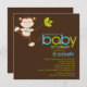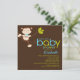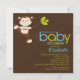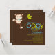 Start your safari baby shower off right with our sweet jungle monkey baby shower invitation. Our monkey shower invitation features the sweetest little monkey with a bow tie swinging on a tree branch set on a trendy brown background with a monkey coordinating back. Visit our shop to view our matching thank you note cards, postage and stickers. ©Petit Tatti
