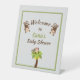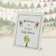 Cute monkeys and casual text combined on light grey background with thin green frame : a fun way to welcome baby shower guests. Personalise this tabletop pedestal sign with Parents-to-be name