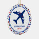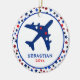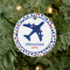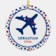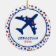 This fun holiday ornament features blue aeroplane with stars flying on a white and blue circle frame with a background of red and blue stars. Add your child's name and year to personalise.