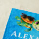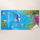 Cute under-the-sea beach towel featuring a jellyfish, starfish, and sea turtles. fish & crab. Perfect for a nautical ocean-themed kid's bathroom.