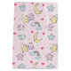 A cute pattern with happy stars, moon, clouds and rainbows on a soft pastel pink background.