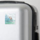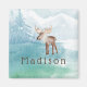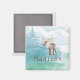 Watercolor holiday illustration features cute moose with winter scene background. Personalise with customisable text in modern brown font