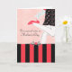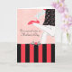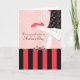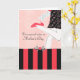 A cute Mothers Day card for sister with a woman in a floral black dress, grey polka dot gloves, red polka shoes and pink polka dot hosiery. Greeting card cover top is pink faded flowers, bottom has bow and red and black stripes. Feel free to add to or customise the provided cover and inside text.
