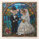 The coaster features a charming stained glass mosaic design of a mouse wedding couple standing under a decorative arch adorned with colourful flowers. The groom, a dapper mouse, wears a tiny black tuxedo with a white bow tie and a small top hat. The bride, a lovely mouse, is dressed in a delicate white wedding gown with a flowing veil, embellished with subtle hints of pastel colours that catch the light beautifully.