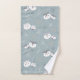 This bathroom towel set features a cute pattern of grey and white owl face illustrations representing a mama owl (with eyelashes) and her son (with a bow tie). They're surrounded by woodland line art drawings of leaves and branches on a light blue-grey background. Ideal for a nursery or boy's bathroom.