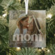 Cute Mum Christmas Glass Ornament. Design featuring a photograph of your choice with the text 'MOM' in trendy transparant lettering along the bottom with an additional line to add text, whether it be a personal message i.e. we love you, happy mother's day, merry christmas or children name/s etc.