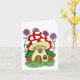 A simple but cute generic any use, any occasion, greeting card featuring an adorable mushroom, toadstool house with two little windows a wooden door and a brown garden fence. The roof is red with white spots. It is surrounded by purple flowers and green grass. Maybe a fairy lives here.