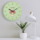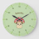 A green wall clock with numbers, an illustration of a cute mushroom in cartoon style customisable text below! This is a great way to make a child's room funny!