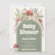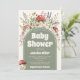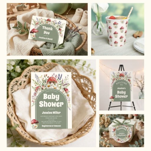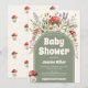 Watercolor mushroom gender neutral baby shower invitation with red toadstool mushrooms, wildflowers, lavender, and greenery in a soft woodland / forest theme style. Cozy boho look with a sage green arch panel and vintage-inspired typography, ideal for a nature baby shower, fall baby shower, whimsical garden party, or woodland baby sprinkle. Customizable wording for baby shower details, host name, date, time, location, RSVP, and registry.