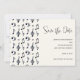 Save the date card with a musical themed design. A pattern with treble clef, bass clef and other musical symbols.