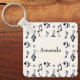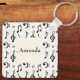 Personalised keychain with a musical themed design. A pattern with treble clef, bass clef and other musical symbols.