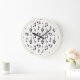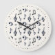 A clock with a musical themed design. A pattern with treble clef, bass clef and other musical symbols.