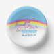 Rainbow baby shower paper bowl, featuring a cute whimsical narwhal watercolor painting. Personalise your baby shower honouring name. Other matching items are available. Unique watercolor art and design by Sarah Trett for www.mylittleeden.com