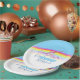 Rainbow baby shower plates, featuring a cute whimsical narwhal watercolor painting. Personalise your baby shower honouring name and date. Other matching items are available. Unique watercolor art and design by Sarah Trett for www.mylittleeden.com