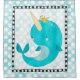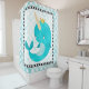Narwhal shower curtain in turquoise, black and white with an adorable narwhal over white polka-dots and stripe trim.