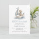 This cute baby shower invitation features a dusty blue and beige watercolor illustration of a teddy bear riding in a sailboat. The words "AHOY! It's a Boy!" and the name of the mom-to-be appear in dusty blue decorative font. The reverse side provides space for diaper raffle, books for baby, and registry details, along with a convenient QR code guests can scan to visit the registry. Ideal for a nautical-themed boy's baby shower.