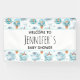 Baby shower banner with a whimsical pattern featuring cute smiling whales happily swimming in the sea.