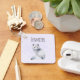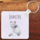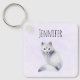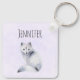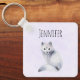 A key chain with a watercolor image of a white fox with fancy blue flora designs all over its fur.
