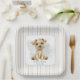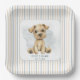 Oh, Boy! Celebrate the sweetest new arrival with our charming baby shower square paper plate, featuring an adorable wide-eyed tan watercolor puppy nestled against a soft dusty blue wash. This precious pup steals the show with its heart-melting gaze, setting the perfect tone for a joyful gathering. The background adds a playful touch with classic tan, white, and dusty blue stripes—tying everything together in timeless style. It's the perfect design to welcome a little one with love, laughter, and just the right amount of puppy-powered charm. Created by Simply Farmhouse Press.