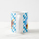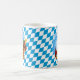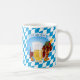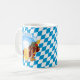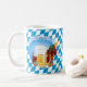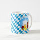 A cute dachshund sits behind a beer mug filled with German beer in this Oktoberfest mug design featuring the blue and white colours of the Bavarian flag.