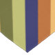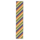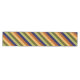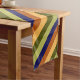 A 16” x 90” table runner featuring a pattern design of multicolored diagonal stripes in olive green, sage green, hazelnut brown, navy blue, and banana yellow.
