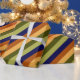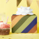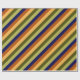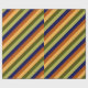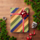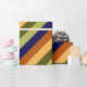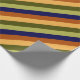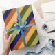 A roll of wrapping paper featuring a pattern design of multicolored diagonal stripes in olive green, sage green, hazelnut brown, navy blue, and banana yellow.