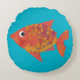 A bright Round Pillow or Cushion, with a cute orange fish on a turquoise blue background that you can change if you wish. Part of the Posh and Painterly "Fish in the Sea" collection.