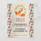 Save the date party postcard with a drawing of a cute fox sleeping peacefully. A green leaves wreath behind. The background is a pattern with pale polka dots and colourful macarons.