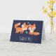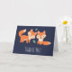 Thank you card with a graphic illustration of 2 orange foxes looking cute and happy. Message on the inside you can personalise. Dark blue background.