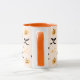 Cute coffee mug featuring whimsical Halloween ghosts, pumpkins, spiderwebs and bats against a light orange backdrop.