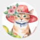 Cute orange tabby cat in sun hat with flowers sticker or envelope seal.
