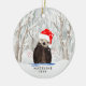 Timeless and cute Christmas ornament featuring an adorable otter with a bright red Santa Claus hat. The watercolor-themed background features a subtle winter snowfall of muted pastels amongst the forest full of trees. Two red hearts accompany the otter. The typography is a classic sans serif print. Personalise with a child's name and the year. Makes a great gift and goes well with other products. Merry Christmas!