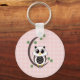 Custom Basic Button Keychain with a vector graphics art design of a cute pink, white, and black owl on a crescent moon shaped branch with leaves and a pink polka dot pattern background.