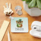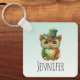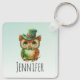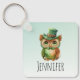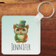 Personalised keychain with a wonderful whimsical illustration. A big eyed brown owl wearing a fancy green top hat and bow tie.