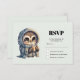 RSVP card with a cute illustration of a cute owl in a winter robe and scarf holding a hot coffee.