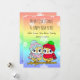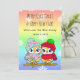 Adorable hand drawn him and her owls, sitting on a tree branch in the winter with pretty pink, blue and teal snowflakes background. Add your custom greeting and names in the personalise area. LGBTQI Christmas card.