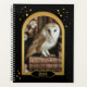 Gold and black year planner featuring a cute barn owl on books, surrounded by festive confetti. On the back is a retro chic polka dot pattern.