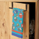 A fun Kitchen Towel or Tea Towel, with a pattern of cute owls in red, blue, green on a turquoise background. The owl pattern was an original handpainted paper collage design by Judy Adamson.