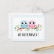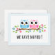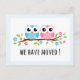 Cute change of address / moving announcement postcard featuring two cute owls, one pink and one blue, sitting on a branch with flowers and green leaves. Below is the text "We have moved". Around the edge of the postcard is a very pale blue border. Design and illustration by MheaDesign. For any enquiries regarding the image or design, please contact me through my facebook page: https://www.facebook.com/MheaDesign