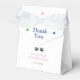 Cute baby panda kids birthday favor box featuring an adorable panda wearing party hat with a panda footprint, bamboo and stars at the background.